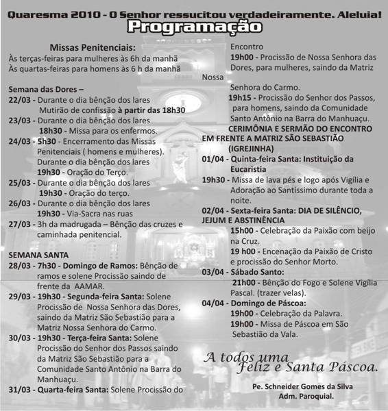 O Padre Schneider ainda crendo na amizade dos seus antigos fiéis de Conselheiro Pena, usa a nossa página para divulgar os ritos da Semana Santa em Aimorés. O que fazemos prazerosamente.