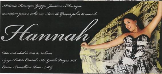 Na idade 15 anos, na personalidade 21, na beleza 1000. Esta é Hannah, filha de Tunico e Janaína. Os nossos parabéns e que seja muito feliz.