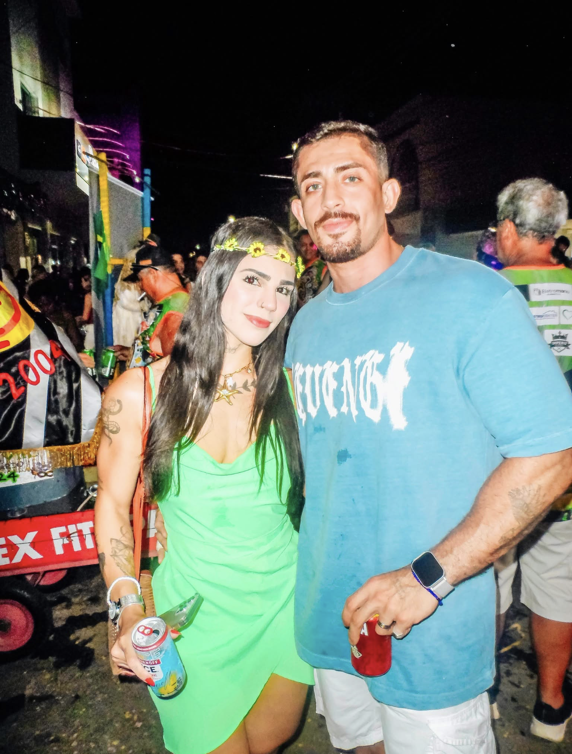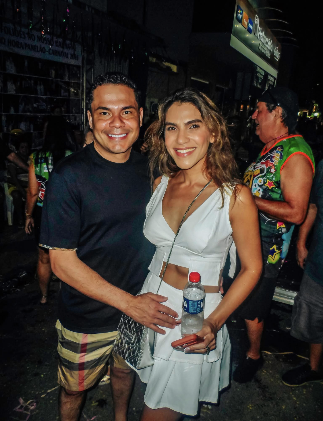 - O casal Flávio/Flávia Pinto, conseguiu um cantinho para aplaudir os artistas do desfile na Passarela do Samba. Ela sempre linda, ele esbanjando simpatia.