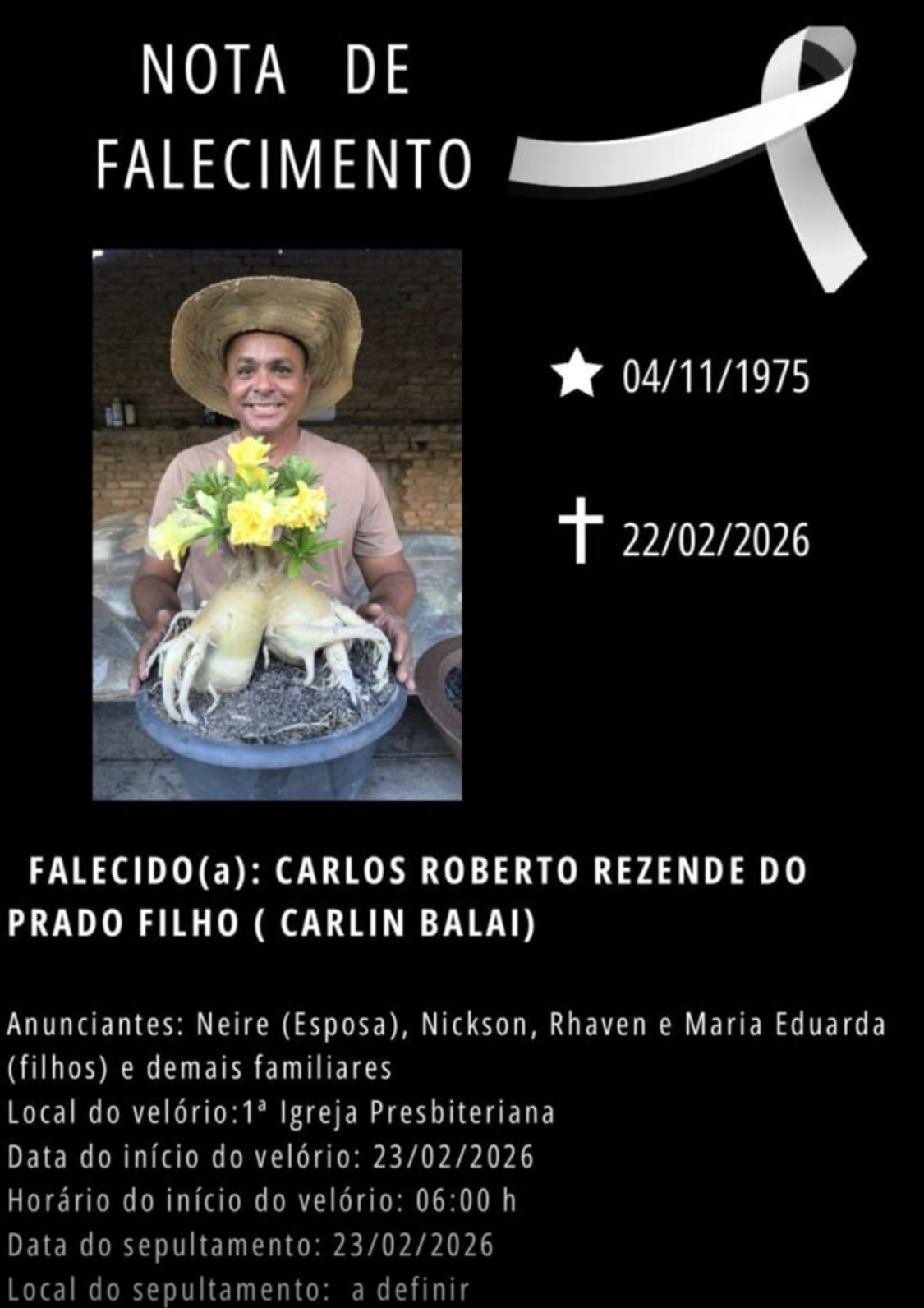 - Acabo de ser notificado sobre o falecimento do amigo Carlinhos Balaio, ocorrido em GV, onde estava internado.