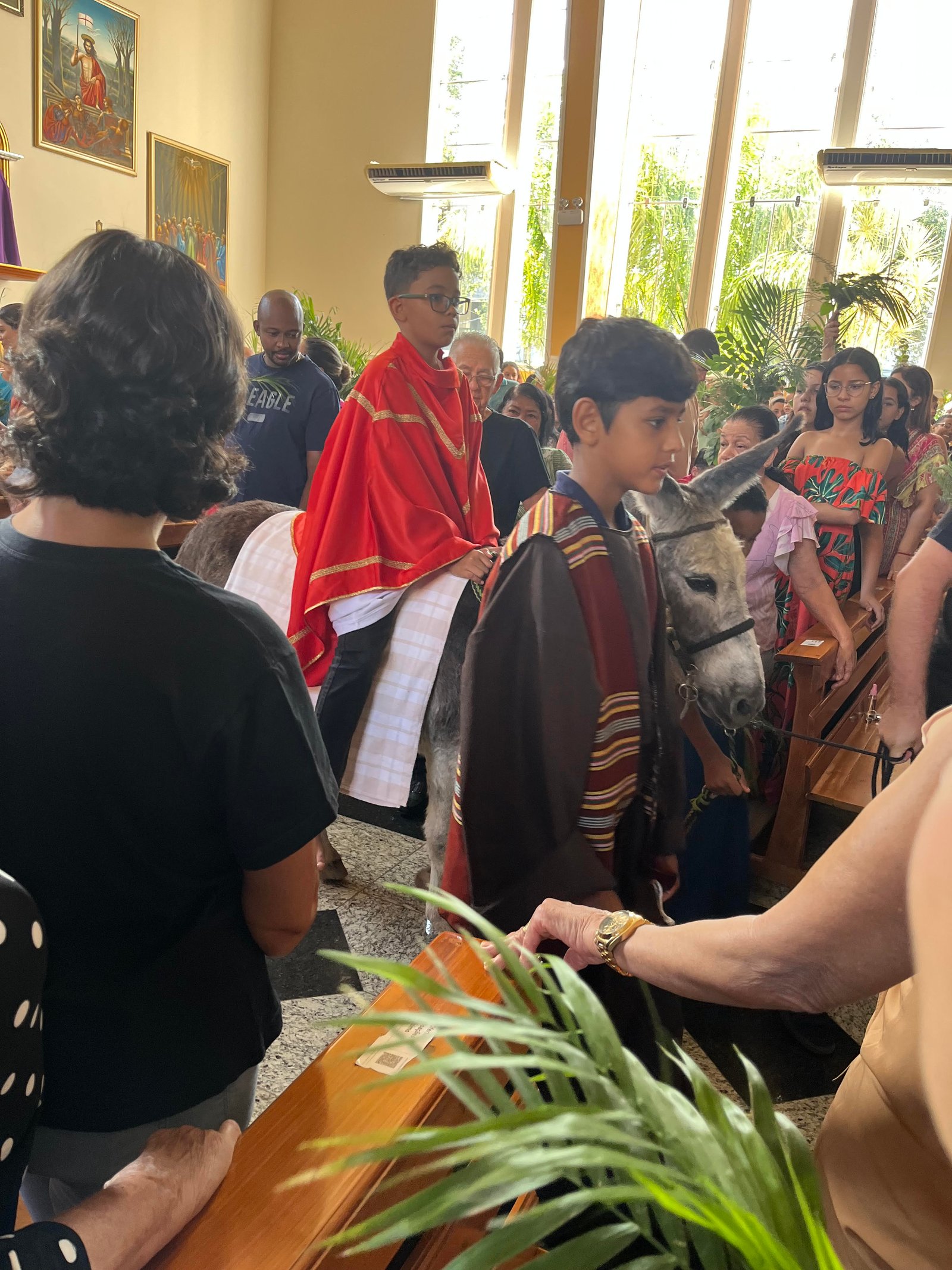 O jumentinho montado  por uma criança caracterizada, entrou calmamente na igreja até o altar.
